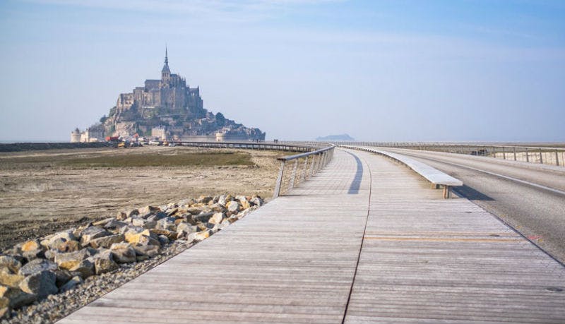 パリからモン・サン・ミッシェルへ向かう車中では、ノルマンディーの田園風景が緑一色に染まり、正午頃に現れる湾は息をのむほどです。