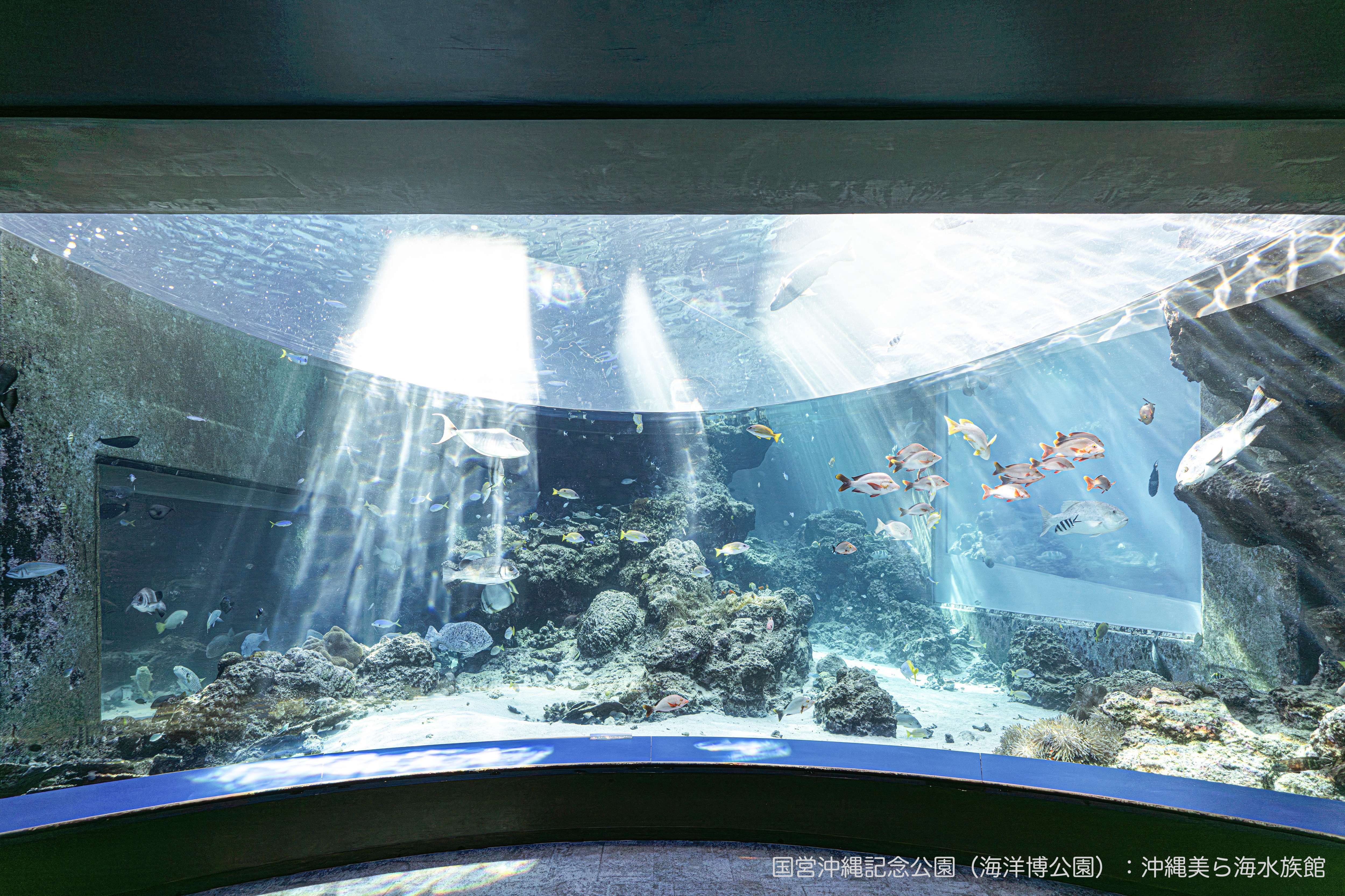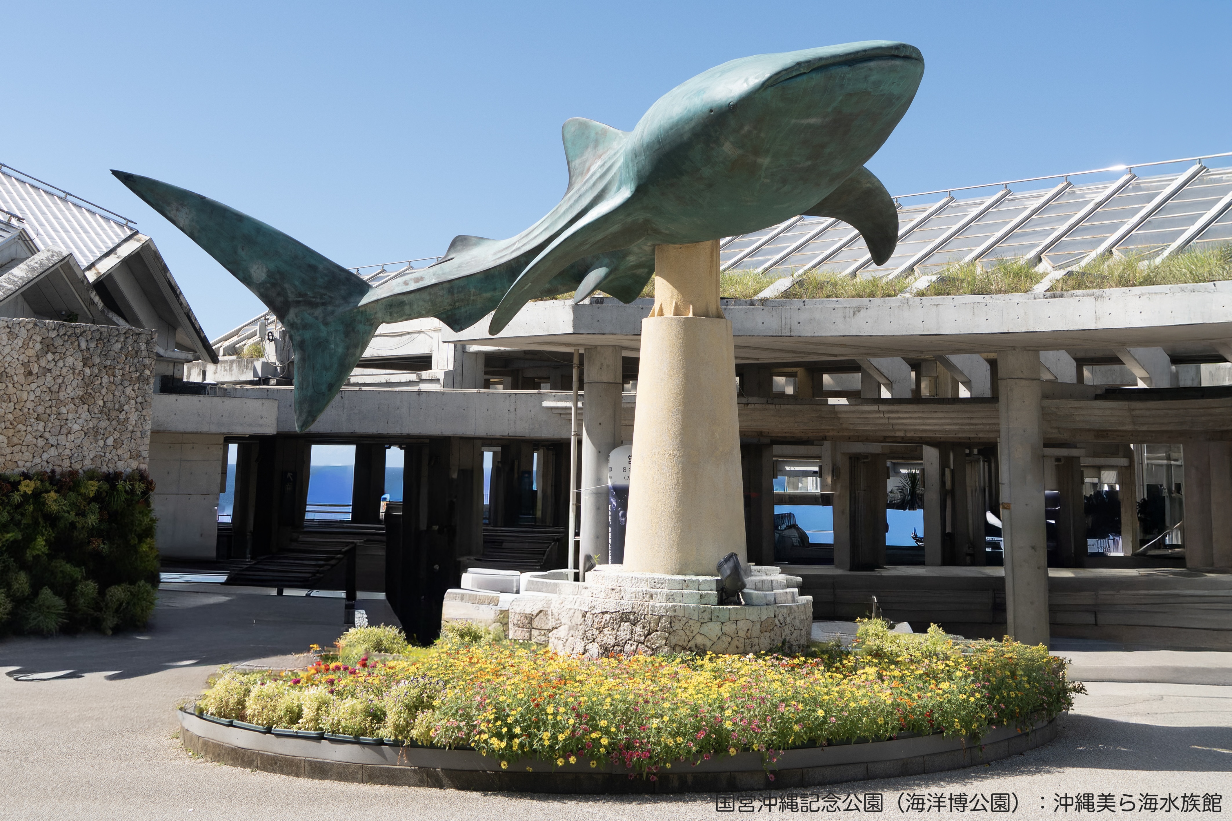 沖縄本島北部の美ら海水族館。巨大な水槽ではジンベエザメやマンタが泳ぐ姿が見られます。