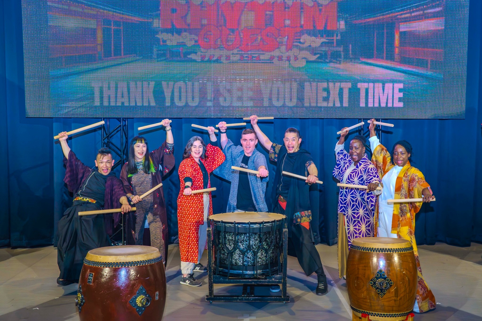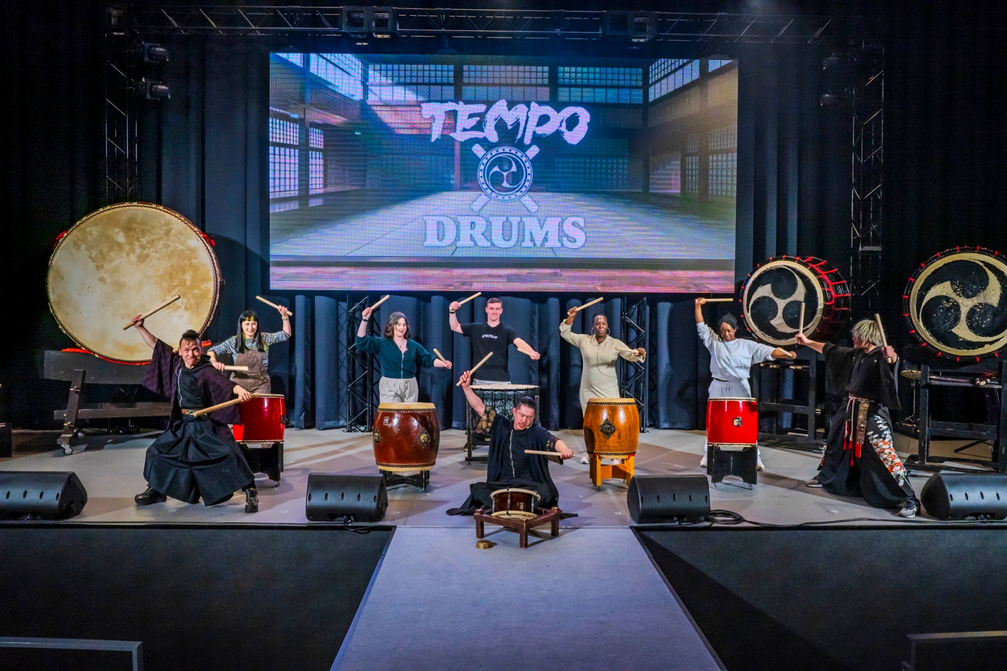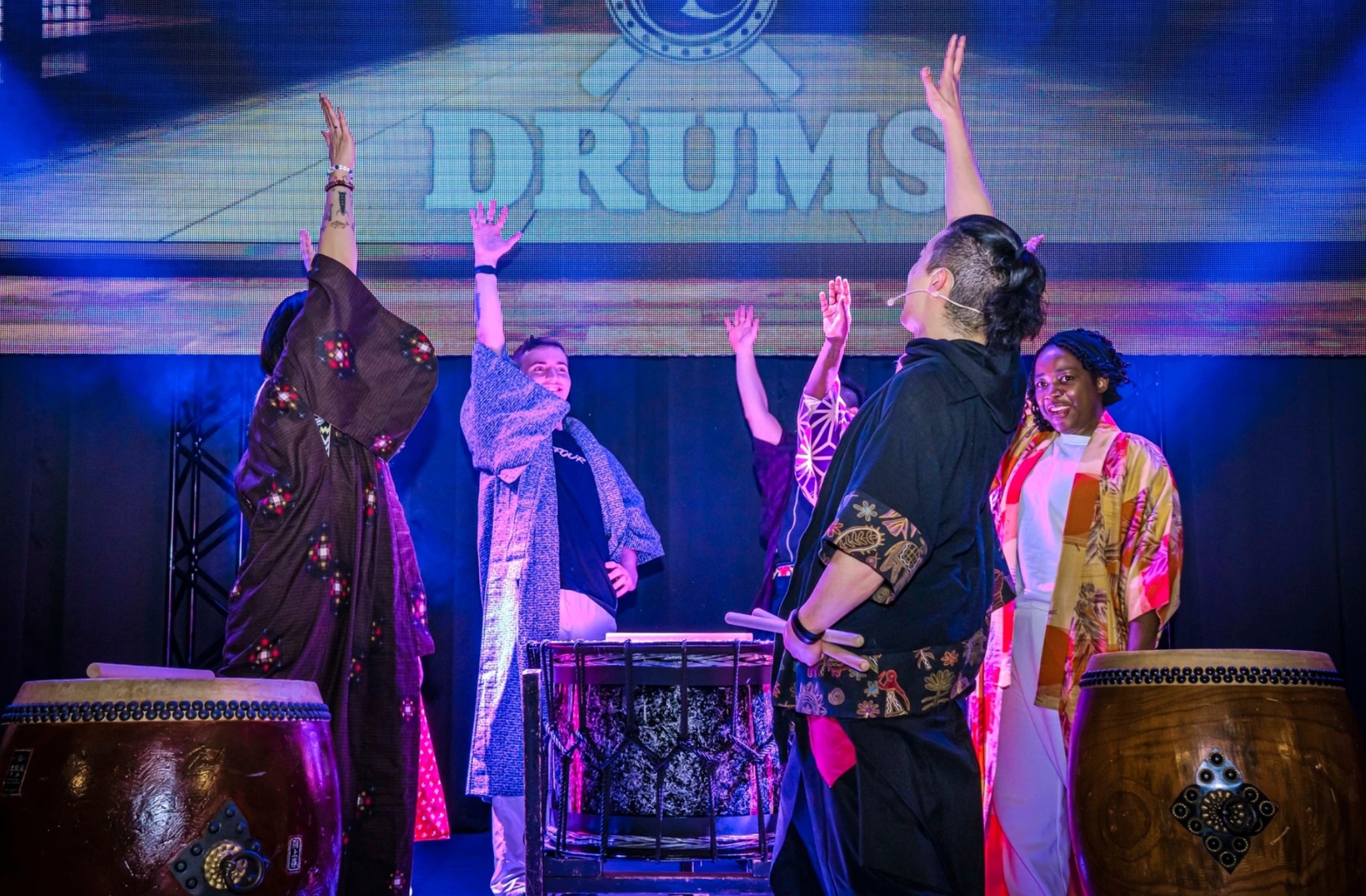 天保山ポートシアター(テンポハーバーシアター)での太鼓ワークショップ体験を楽しみましょう! 本体験には、衣料品&アクセサリー、バチ、ボーナスビデオのレンタルが含まれます。 耳で楽しむだけでなく、和太鼓と一体となって盛り上がること間違いなし!